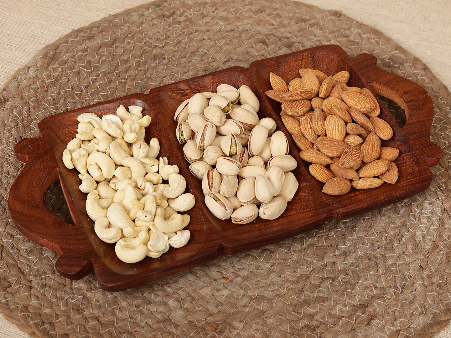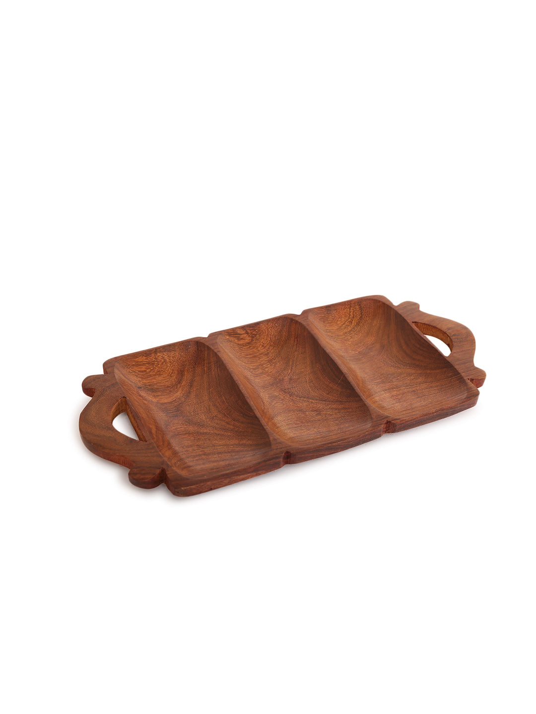Elevate your hosting game with natural elegance using this Handcrafted 3-Section Sheesham Wood Serving Tray from Homeique. Designed with smooth, deep compartments and curved integrated handles, this piece is perfect for serving a variety of snacks, dry fruits, or condiments—all in one tray.