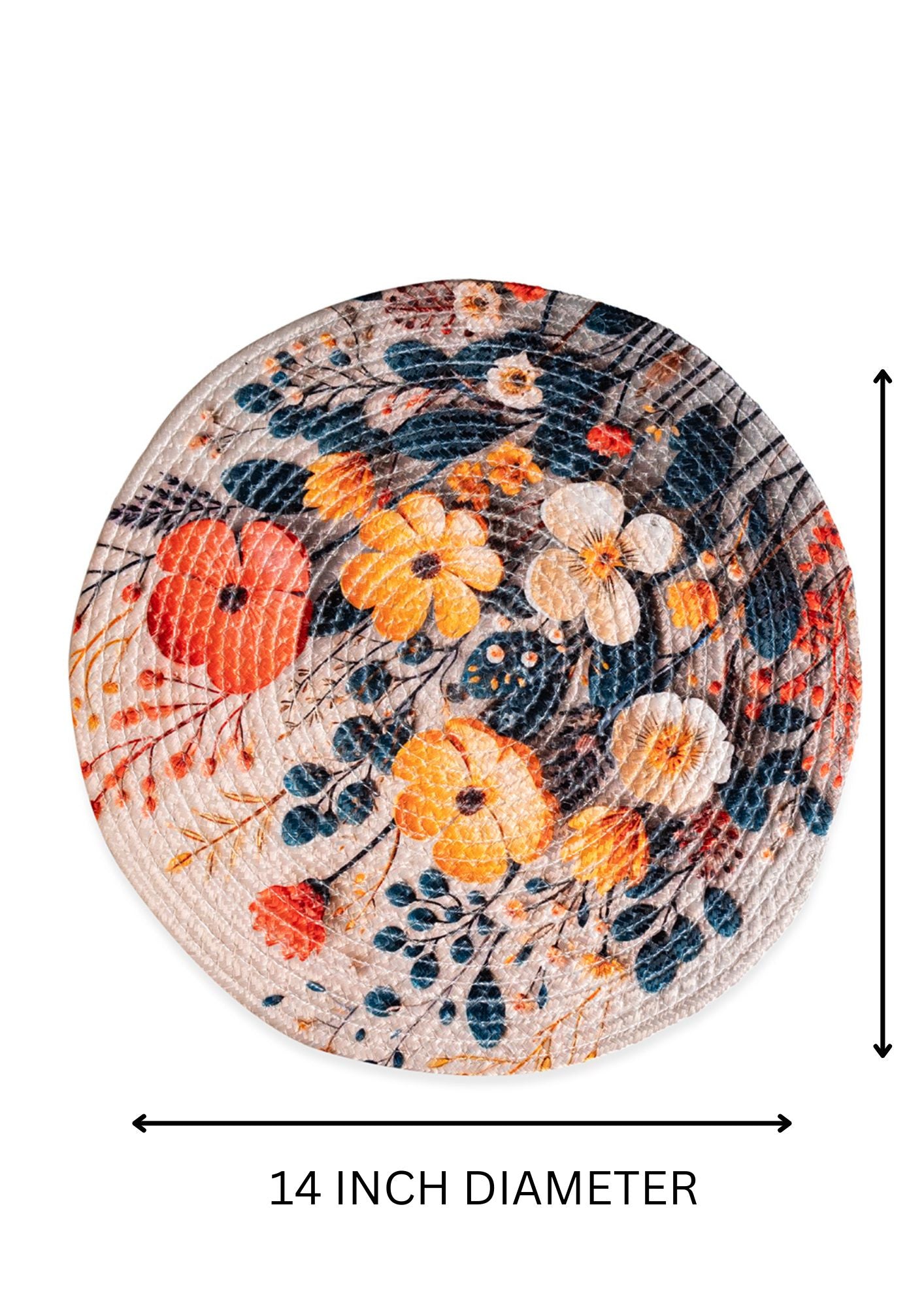 Add a touch of elegance to your dining table with our 14-inch round table placement mat. Made from durable printed cotton, this mat not only offers protection for your table but also adds a stylish touch to your home interiors. The beautiful design and high-quality material make it a must-have for any dining setting. Whether you're hosting a dinner party or enjoying a family meal, our round table placement mat will elevate your dining experience. Don't settle for a plain table setting, upgrade to our stunning mat and impress your guests.