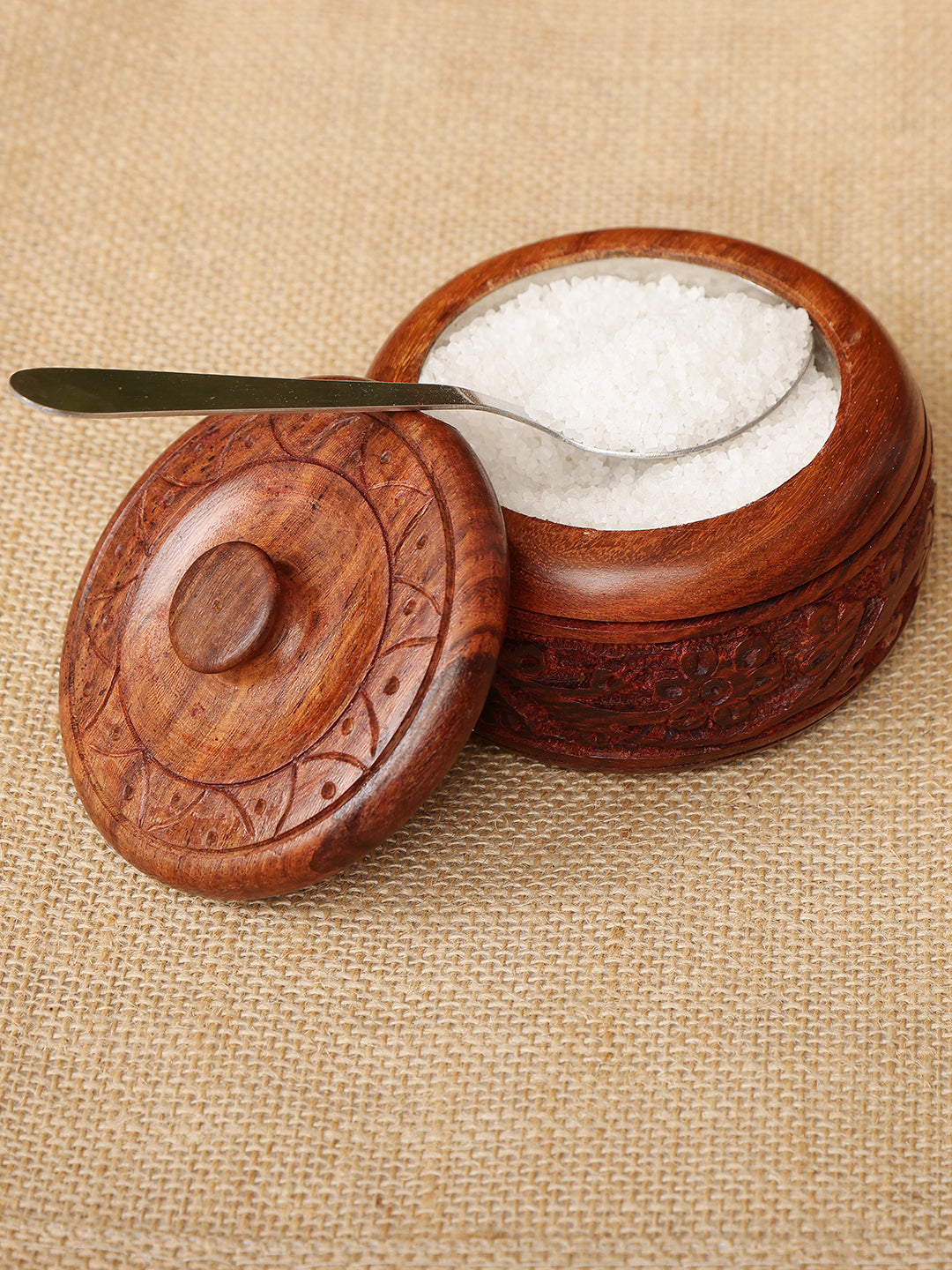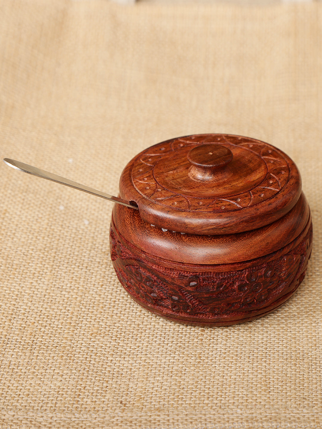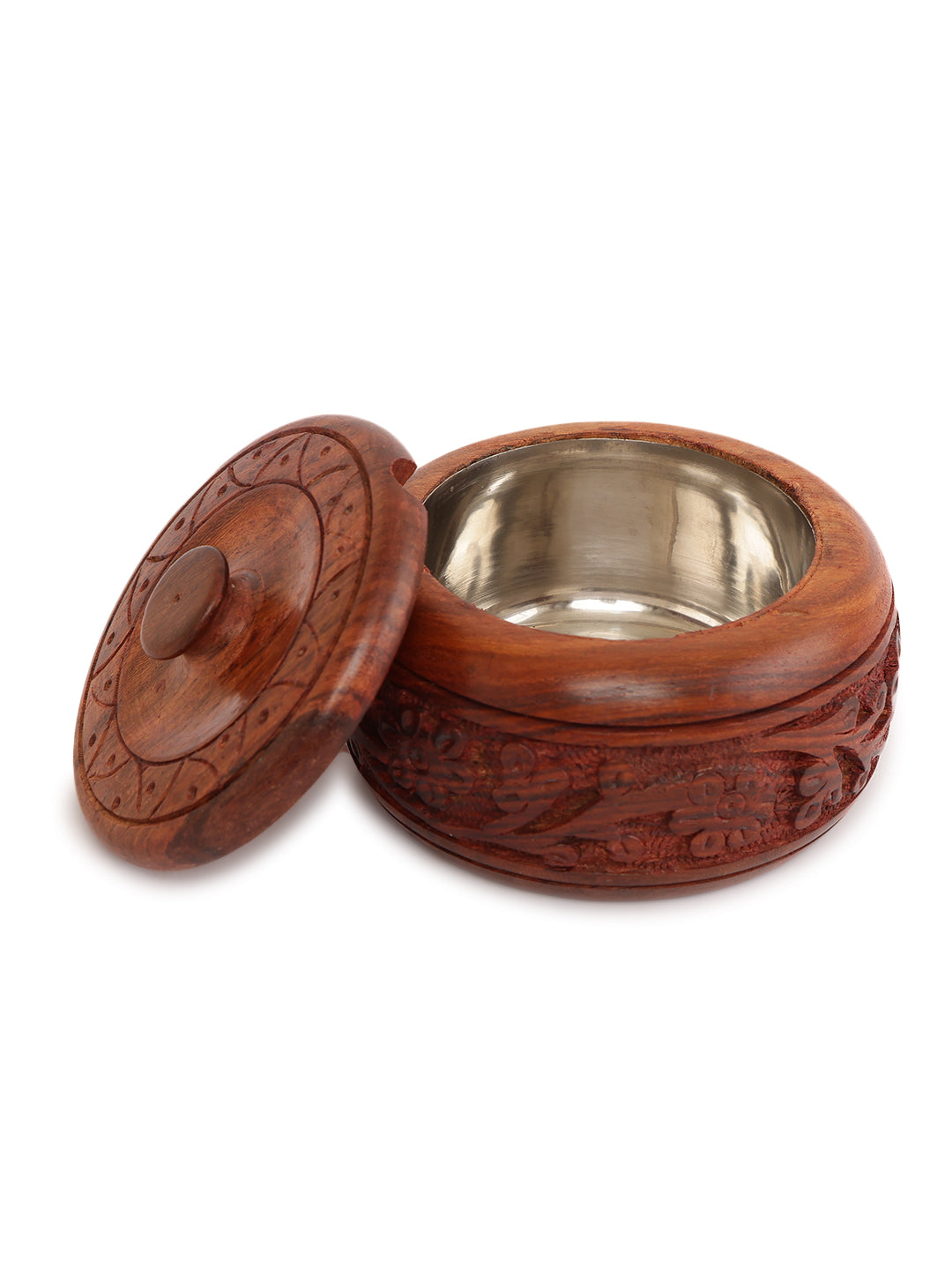 Intricate Hand Carvings: The lid and exterior are adorned with detailed, artisanal carvings, reflecting skilled craftsmanship and adding visual texture.