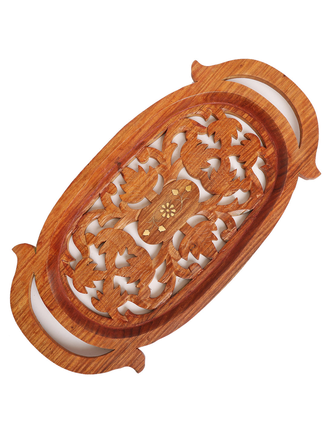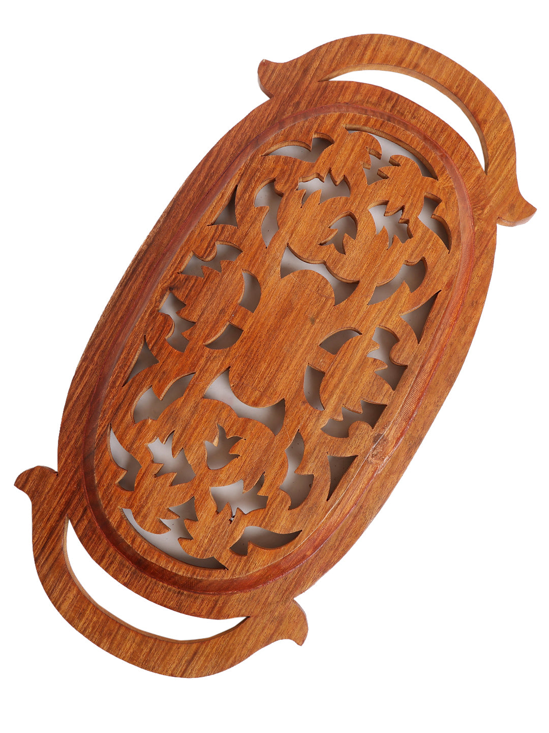 "Bring elegance to your serving experience with this beautifully handcrafted Sheesham wood tray. Featuring intricate floral carvings and a traditional oval shape, this tray adds a classic touch to your kitchen or living room. The natural finish enhances its rich wood texture while the strong side handles make it practical for daily use or special occasions. A perfect blend of functionality and style!