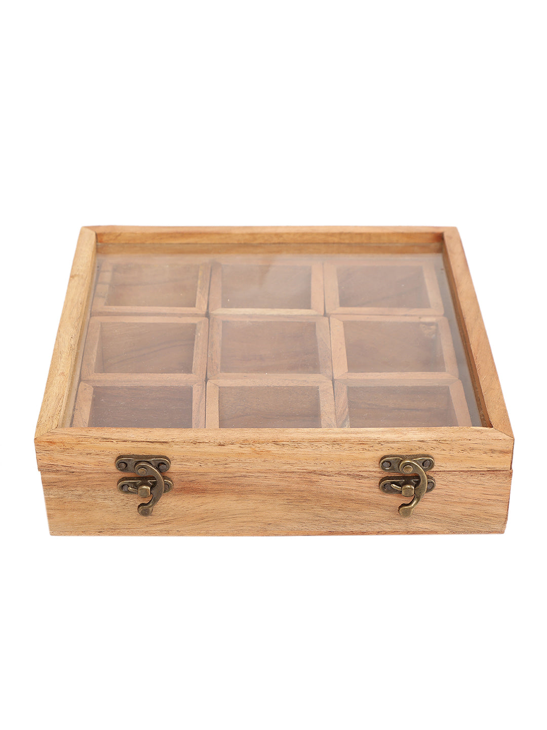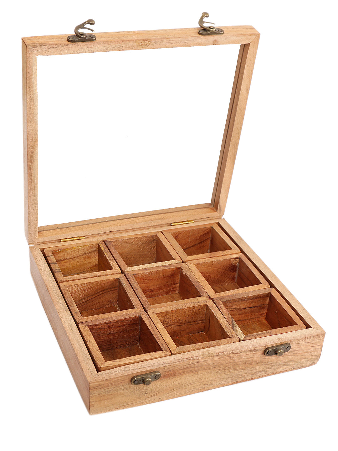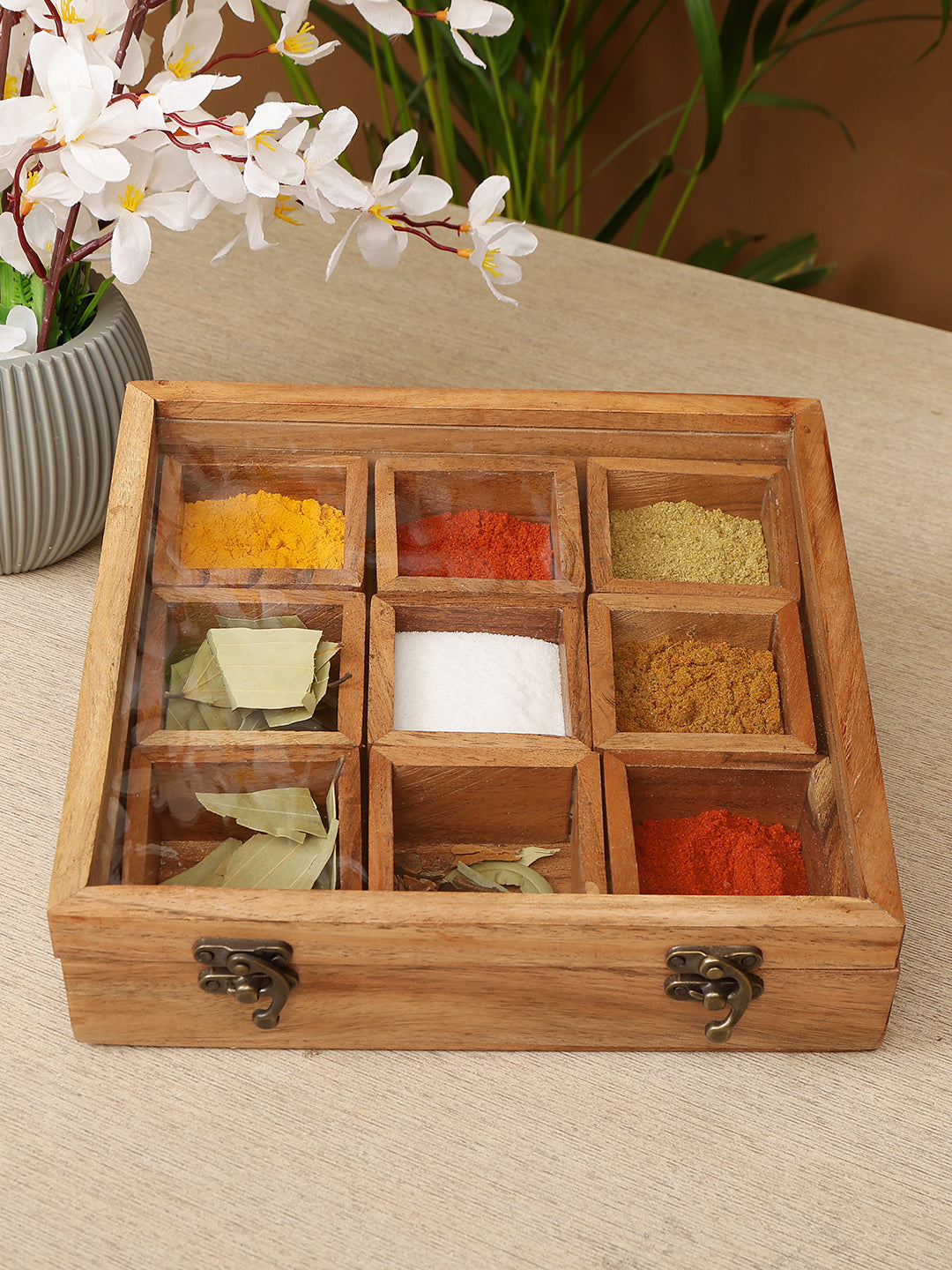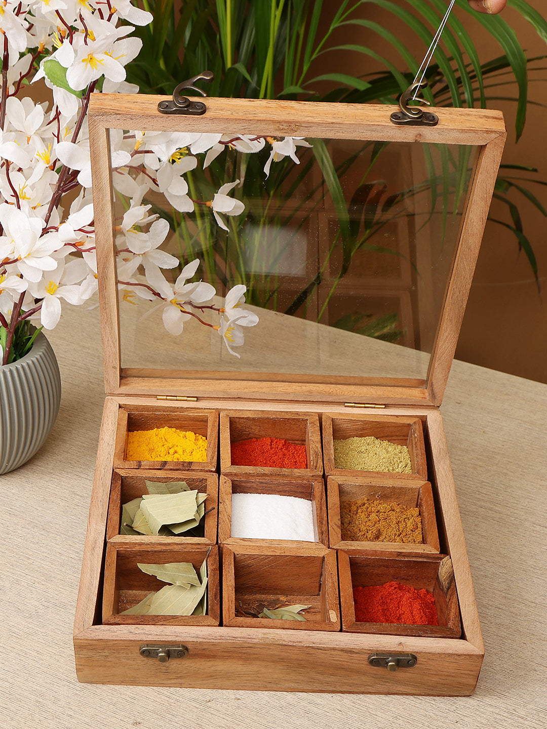 "Handcrafted Wooden Spice Box with Multiple Compartments & Lid"