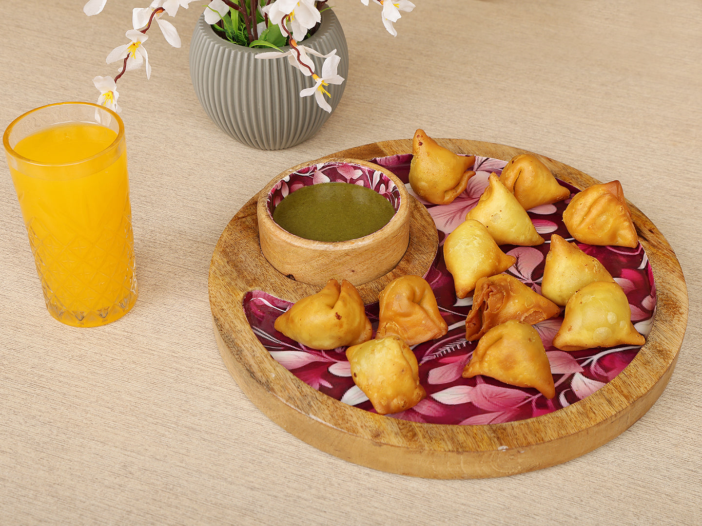 Homeique Round Wooden Floral Printed Serving Platter with Dip Bowl