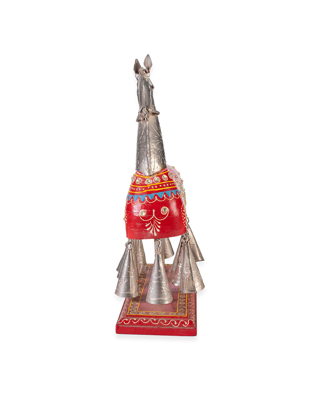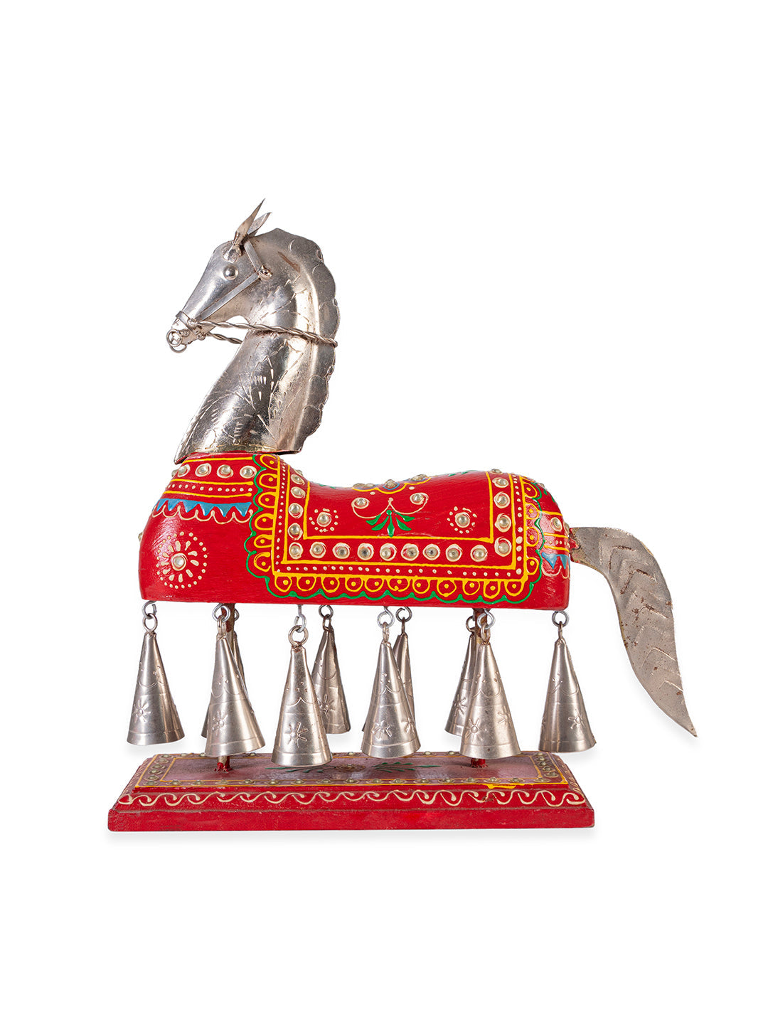 This hand-painted wood and metal craft horse figurine is inspired by Rajasthan's traditional 'Kacchi-Ghodi/Elephant-Dance'. It is decorated with 10 metal bells, making it not only a beautiful decor piece but also a symbol of prosperity. In Rajasthan, elephant sculptures and articles are believed to bring strength, wisdom, and good fortune to households, temples, and workplaces.