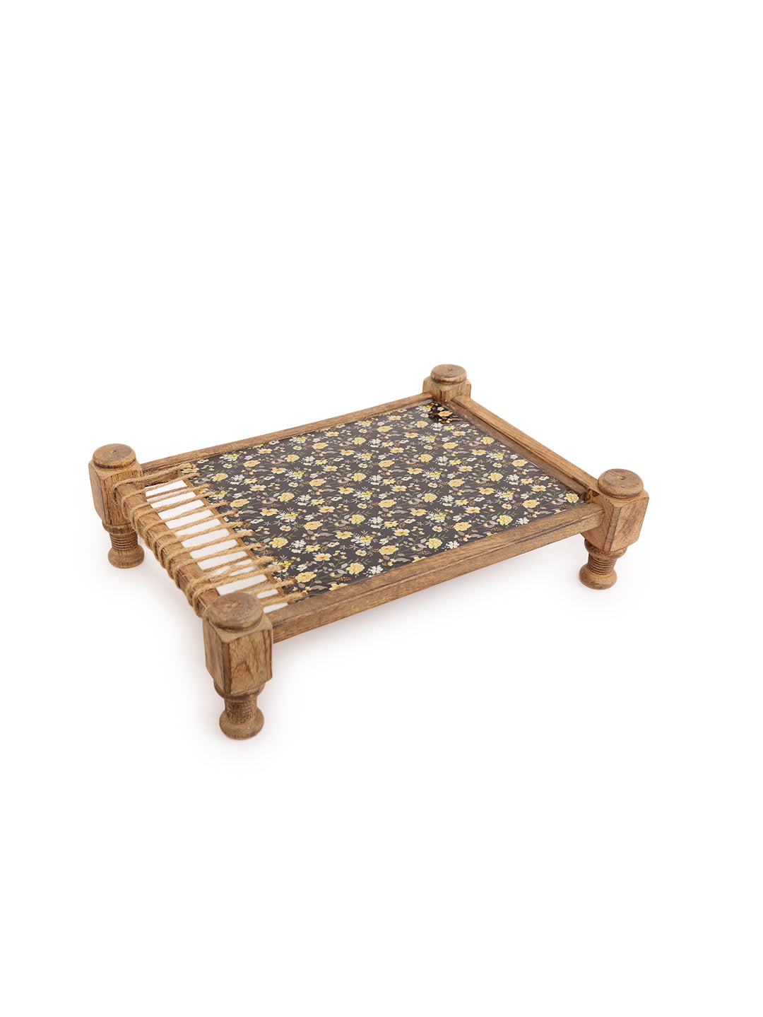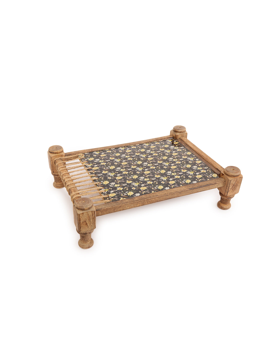 Bring a unique and culturally inspired touch to your serving rituals with our Rustic Khaat-Style Wooden Serving Platter. This distinctive piece draws inspiration from the traditional Indian "khaat" or charpoy, featuring a simple wooden frame reminiscent of its structure. The central serving area showcases a beautiful floral fabric inlay, protected by a clear coating, creating a vibrant and textured surface for presenting your culinary delights.
