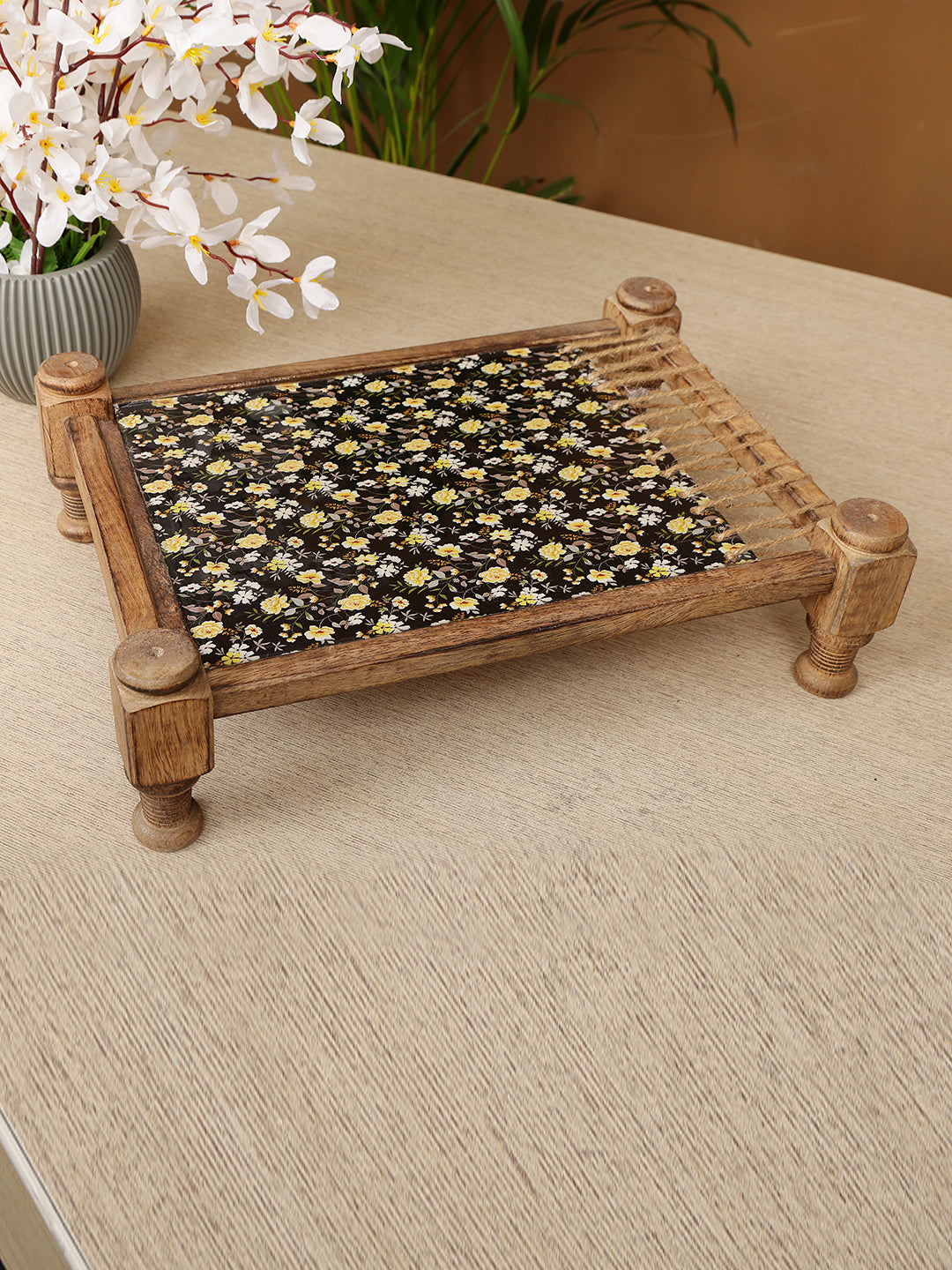 Vibrant Floral Fabric Inlay: The central serving area showcases a colorful and eye-catching floral fabric.