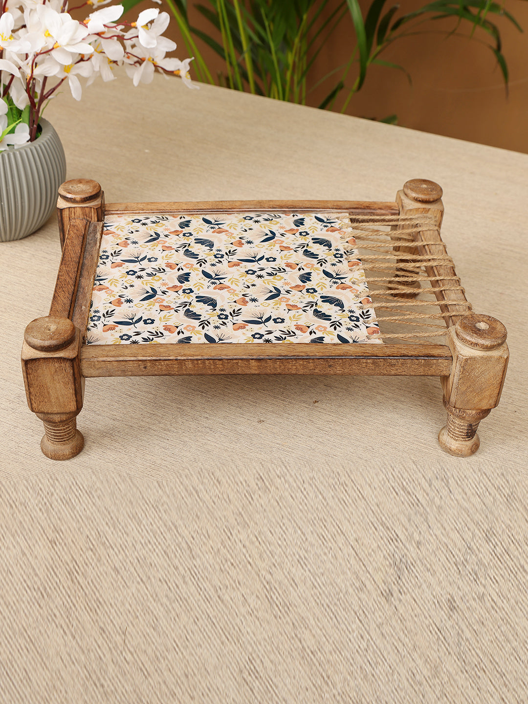 Vibrant Floral Fabric Inlay: The central serving area showcases a colorful and eye-catching floral fabric.